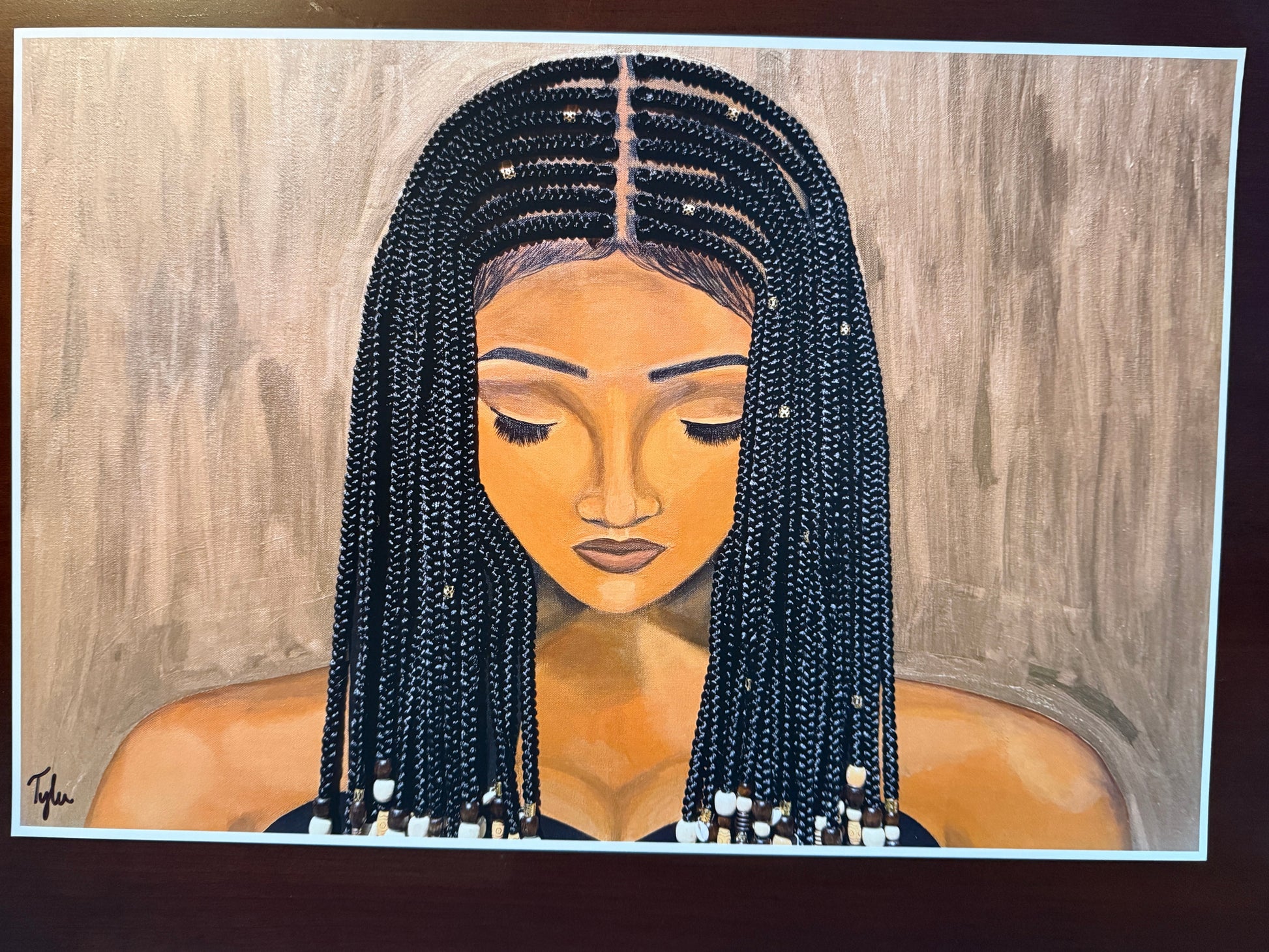 12X18 2D print of a woman with natural hair in braids with beads on the end. A reminder that God is still doing miracles. This print does not have real hair added.